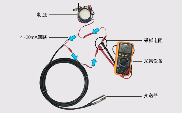 The following figure is a typical usage of most customer two-wire 4-20mA transmitters. After the transmitter is powered to work normally, the loop current is proportional to the pressure by collecting the pressure to be measured to output the 4 to 20 mA signal. The customer connects the sampling resistor(typical value 100 <UNK>, 250 <UNK>) on the return road, and the current flows through the sampling Resistor. After conversion to voltage signal, For use by the backend collection system. Typically, the sampled resistance is integrated into the collection device.